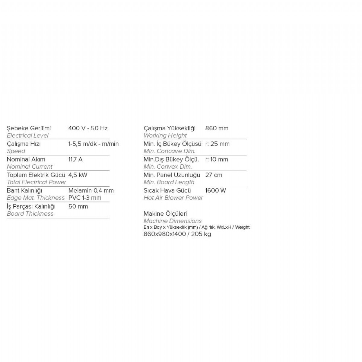 0,4 melamin ile 1 – 3 mm arası PVC ve ABS bantları düz ve eğri kenarlı parçalara yapıştırma işlemi uygulayan manuel kenar bantlama makinesidir. Küçük hacmi sayesinde az yer kaplayan ekonomik ve kullanımı kolay bir makinedir.